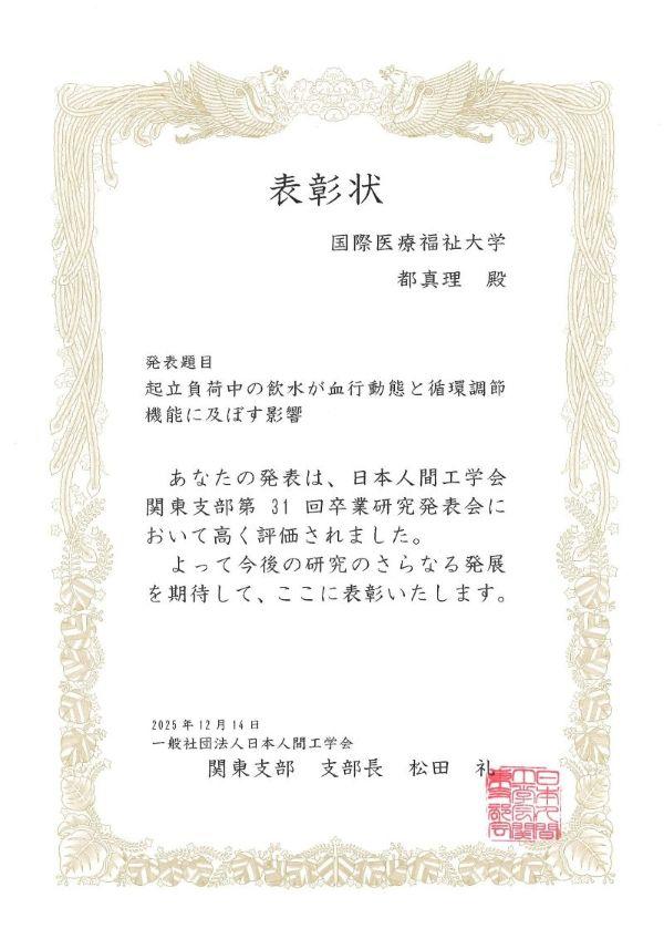 窪田ゼミの学生たちは、チームで実験、データ分析、プレゼンテーション準備に取り組み、研究室を代表して都真理さんが発表を担当しました。発表後、会場では複数の研究者から質問が寄せられ、研究の今後の展開に期待する声も聞かれました。さらに、発表内容が高く評価され、優秀演題として表彰されました。窪田ゼミは昨年度・一昨年度も表彰されており、今年度で3年連続の快挙となります。